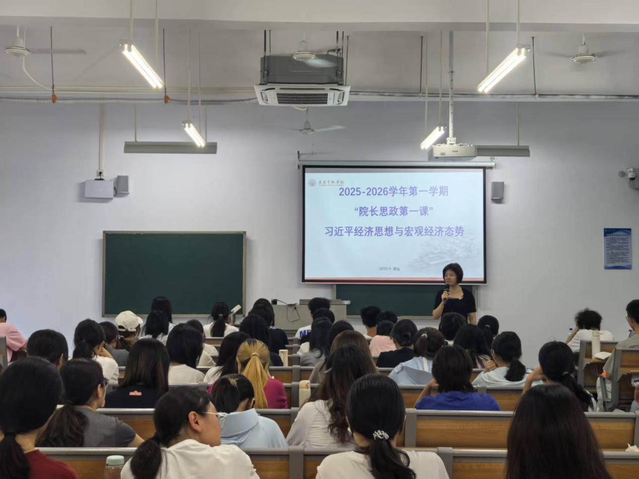 9月17日,张玲院长在清远校区北教215教室为24级学生讲授“思政第一课”。她以“习近平经济思想与宏观经济态势”为题,从“认知决定发展高度”切入,结合案例强调认知对把握经济规律的重要性。通过关键数据展现中国经济的韧性与潜力,深入解读新质生产力、“新三样”、超长期特别国债等国家战略,阐明高质量发展路径,帮助学生构建宏观经济系统认知。在习近平经济思想讲解中,课程突出“以人民为中心”的发展立场,围绕创新、协调、绿色、开放、共享的新发展理念,结合“建设金融强国”目标,重点解析科技金融、绿色金融、普惠金融、养老金融、数字金融五篇“金融大文章”,衔接专业教学与学生职业发展。最后,她对学生提出三点要求:一是主动关注时事动态,将专业知识学习与国家经济发展需求紧密结合;二是聚焦数字经济、绿色金融等重点领域,提升认知能力与专业素养;三是摒弃浮躁心态,以创新思维为实体经济发展、金融风险防范贡献力量。