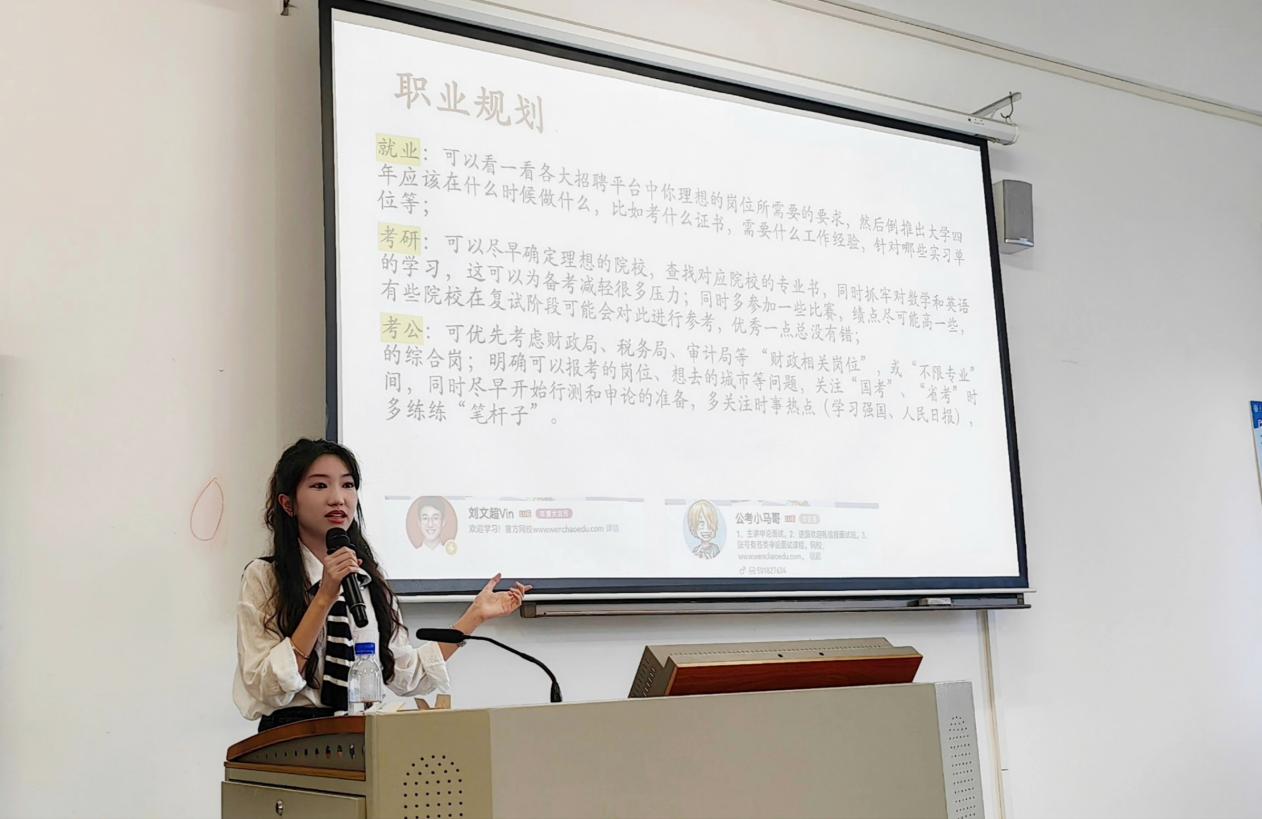 在学业交流环节,张蓝天同学系统梳理了大学阶段的学业评价体系,并分享了宝贵的学习心得。在职业规划方面,张蓝天结合财政学专业特色,为同学们系统介绍了就业、继续深造与公共服务等多元发展路径,并提出了具有前瞻性的建议。此外,还结合专业特点,推荐了一系列有助于提升专业素养的证书考试与学科竞赛,鼓励同学们在实践中锻炼能力、拓展视野。