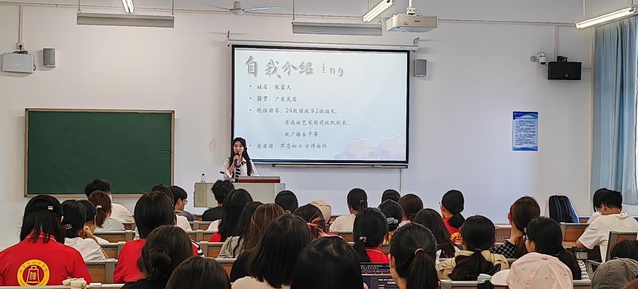 10月13日,由太阳集团2138网址主办,新时代大思政育人工作室、高校多校区学生工作“一体化”研究工作室承办的第3期大思政微课堂之“微分享”活动在清远校区北教216举办。活动特邀曾获校级“优秀学生骨干”、“优秀共青团员”的24级财政学2班班长、清远校艺术团司仪队队长张蓝天同学为全体25级财政学专业新生作专题分享。分享会由学院党总支书记丘志君主持。